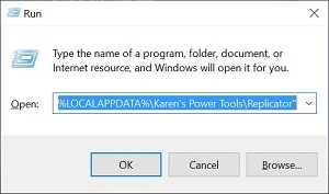 Type explorer "%LOCALAPPDATA%\Karen's Power Tools\Replicator"