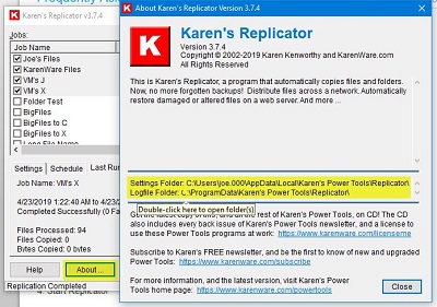 Create a job to replicate that directory. You'll need to use the real, absolute path. In my case, that would be C:\Users\joe\AppData\Local\ Karen's Power Tools\Replicator, but yours will differ according to your user name.